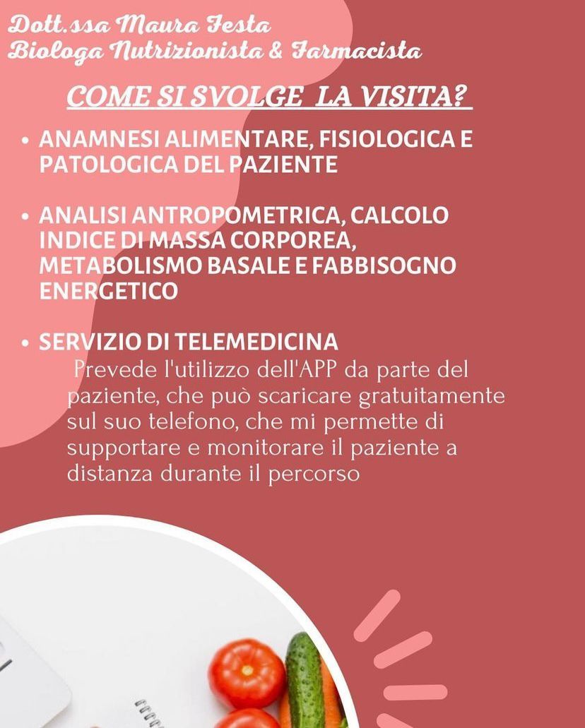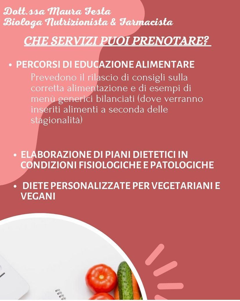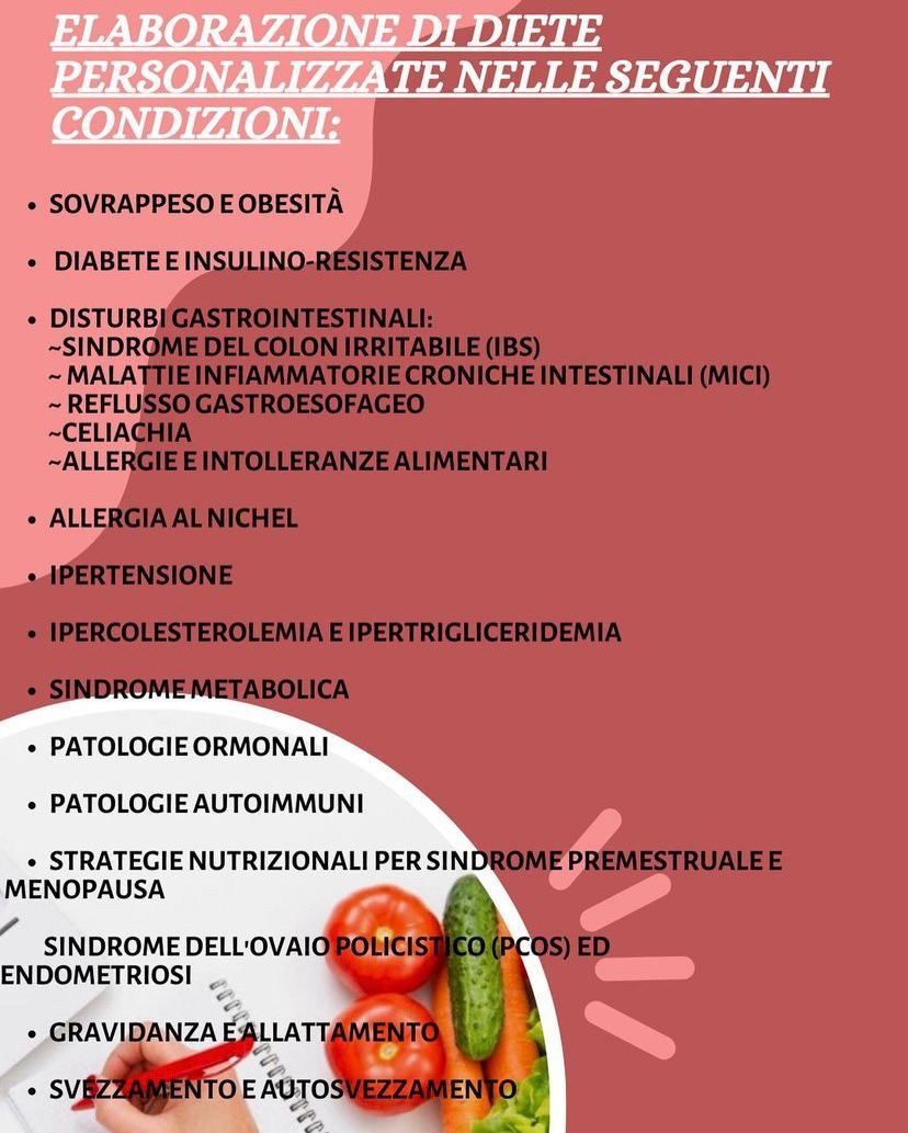 Per quanto riguarda il mio lavoro di nutrizionista mi occupo di redigere diete e piani alimentari personalizzati, sia in condizioni fisiologiche che patologiche, ma anche percorsi di educazione alimentare.